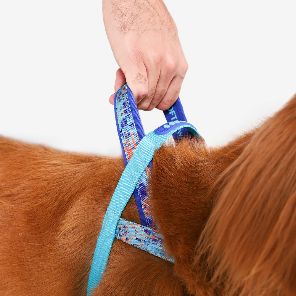 The Error # 404 SofterWalk Harness is a no-pull dog harness that's designed to give both your dog and you a smoother, comfortable walk. This harness is part of the Glitch collection. Great for dogs that pull, these harnesses come with two D-rings - one on the back and one on the front, which helps guide the dog towards you when they try to pull. The harness is completely adjustable for the perfect fit and is made from soft fabric that is comfortable on the dog's fur. There's a padded control handle on the top which can be used when needed.