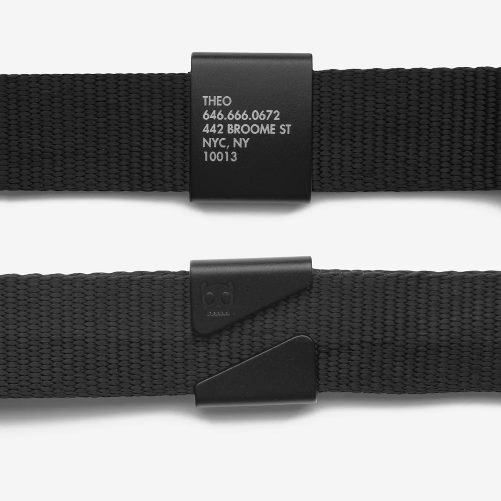 Made from ultra durable anodized aluminum, the black dog ID tag is not your ordinary dog tag. For starters, they are completely silent, which means no jingling and annoying sounds when your dog moves. These sleek silent dog tags also attach seamlessly to collars, so there’s no need to worry about them falling off. Engrave your dog’s important information, at no extra cost. These quiet ID tags look great on your favorite Zee.Dog collars. The black ID Tag has high visibility text for legibility.