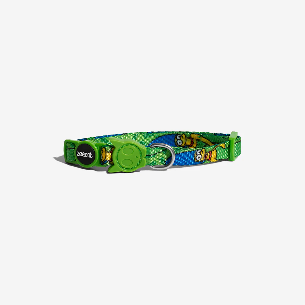 The Marge Simpson cat collar is part of the exclusive Zee.Dog + The Simpsons collaboration. Our Zee.Cat collars are made of super soft polyester and are one size fits all. These breakaway cat collars comes with a quick release, breakaway buckle that automatically opens if your cat gets stuck.