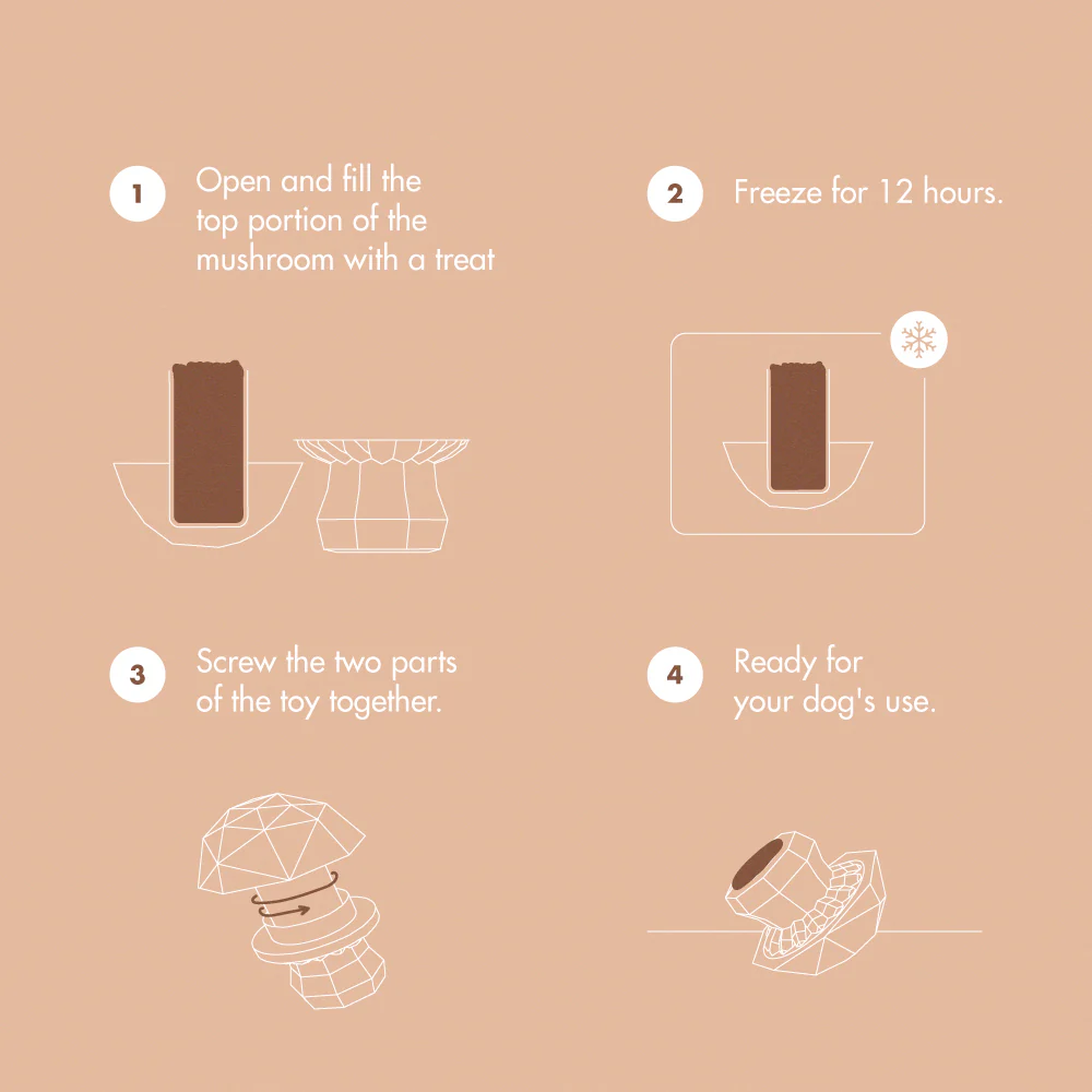 The Mushroom treat dispensing dog toy is designed for mess-free frozen treats. Part of the SuperVeggiez collection, it has a flat top to add peanut butter, yogurt, or broth-based wet treats. Freeze the toy for 12 hours and it is ready for your dog. Made from durable, non-toxic natural rubber, it’s a great way to cool your dog down and extend playtime. Ideal for dogs who love licking, chewing, and staying engaged.