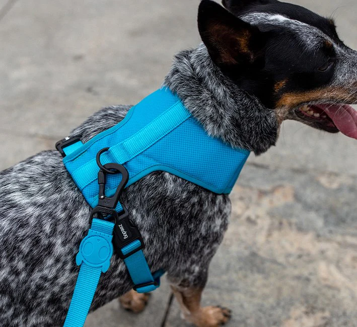 The Ultimate Blue halter harness is easy-to-use and is fully adjustable with two d-ring placements on the back, providing two safe options to clip your leash.
